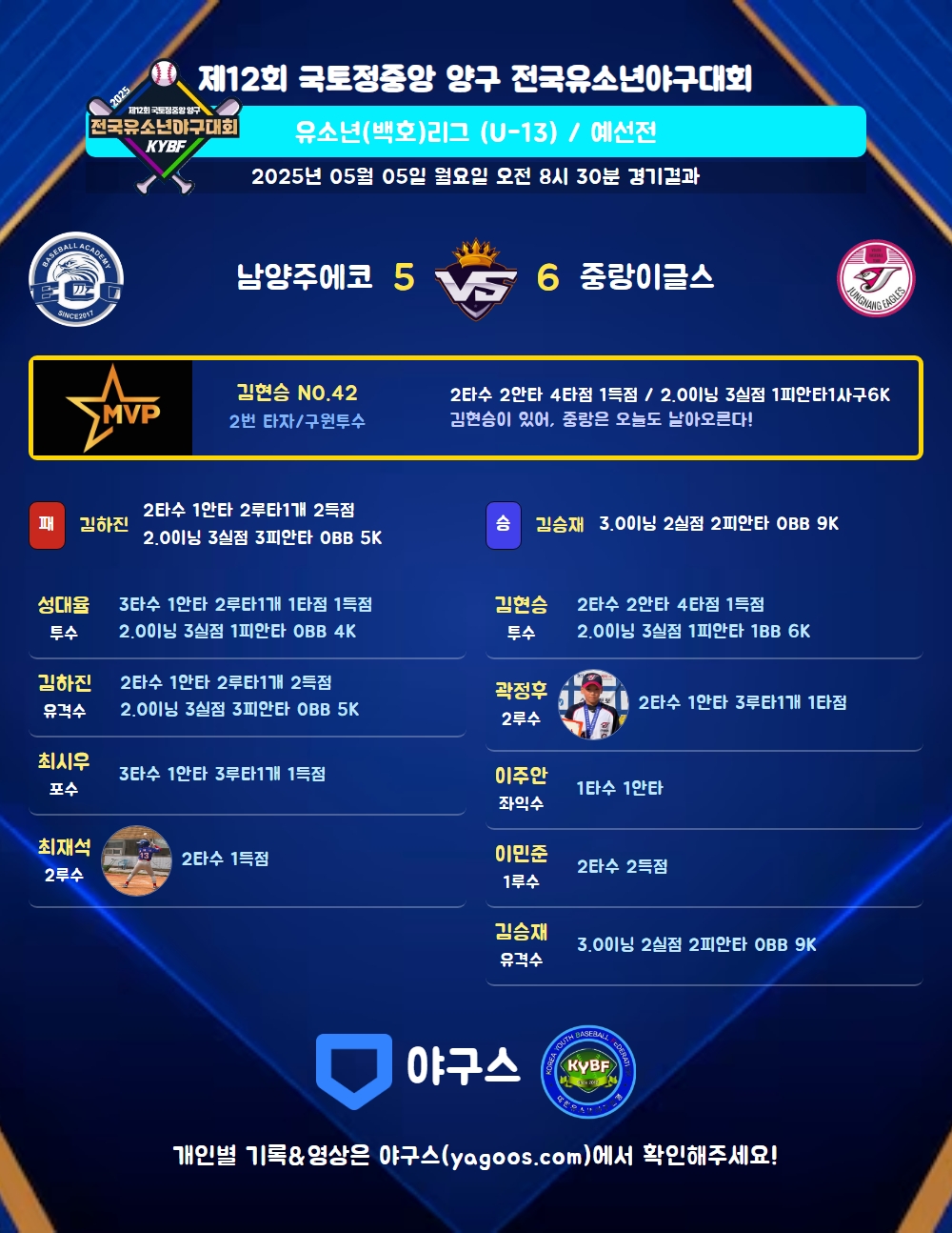 | 2 | 투 | 김현승(42) | 4구 | - | 중안(2타점) | 중안(2타점) | - | - | 2 | 2 | 4 | 1 | - | 3 | 1 | - | 1.000 |