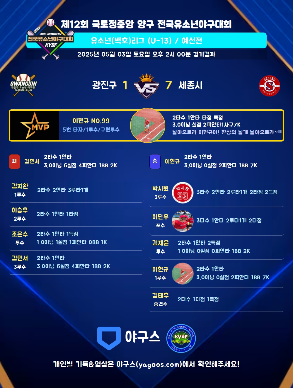| 1 | 이현규(99) | 승 | 3.0 | 12 | 10 | 2 | - | 2 | 7 | 48 | - | - | 0 |