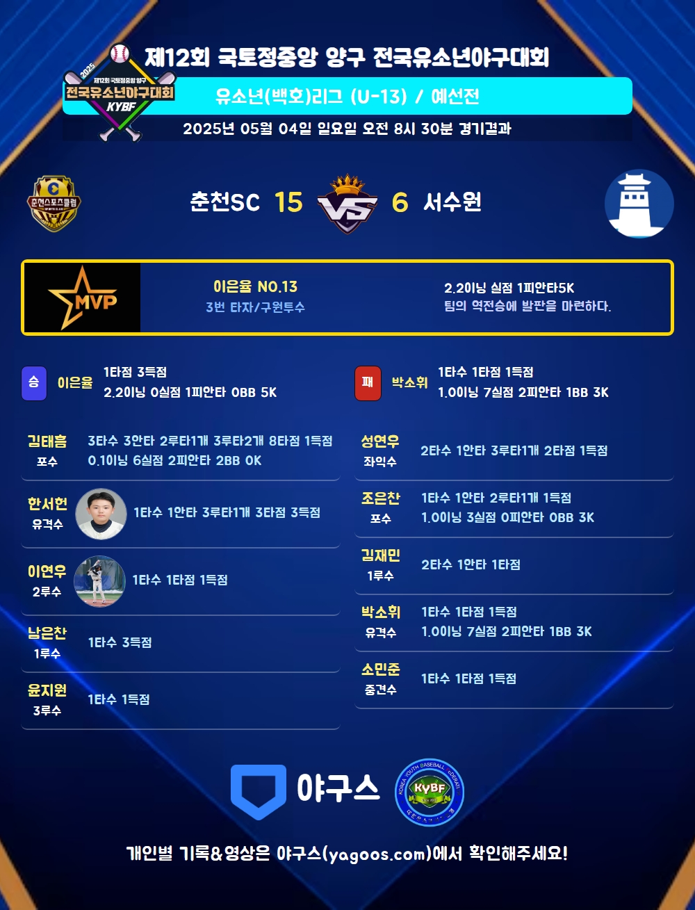 | 2 | 이은율(13) | 승 | 2.2 | 8 | 8 | 1 | - | - | 5 | 28 | - | - | 0 |