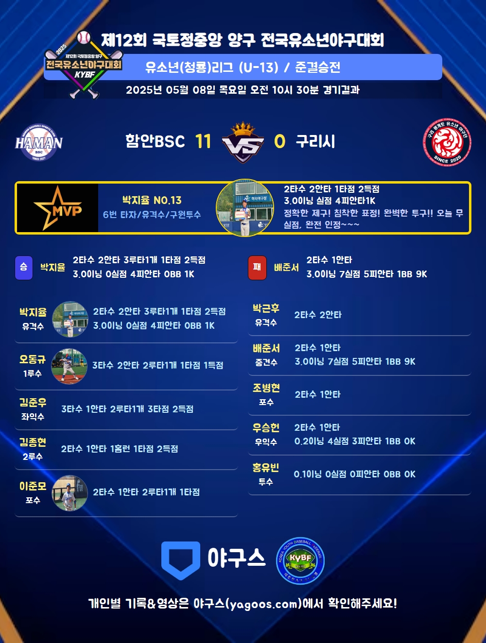 | 1 | 박지율(13) | 승 | 3.0 | 12 | 12 | 4 | - | - | 1 | 28 | - | - | 0 |