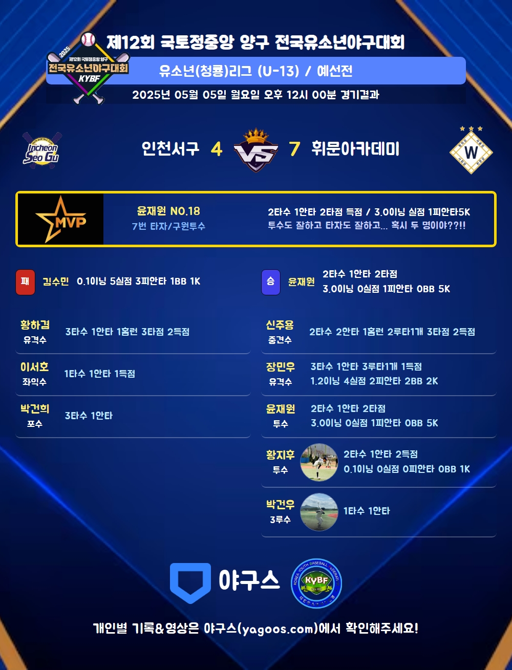 | 1 | 윤재원(18) | 승 | 3.0 | 9 | 8 | 1 | - | - | 5 | 40 | - | - | 0 |