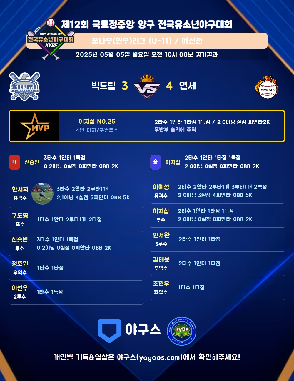 | 4 | 투 | 이지섭(25) | 투땅 | - | 3내안(1타점) | - | - | - | 2 | 1 | 1 | 1 | - | 2 | - | - | 0.500 |