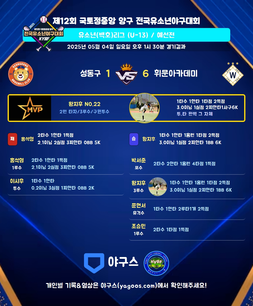 | 휘문아카데미 | 2 | 0 | 4 | 0 | 0 | 0 | 6 | 6 | 0 | 2 | 1 |