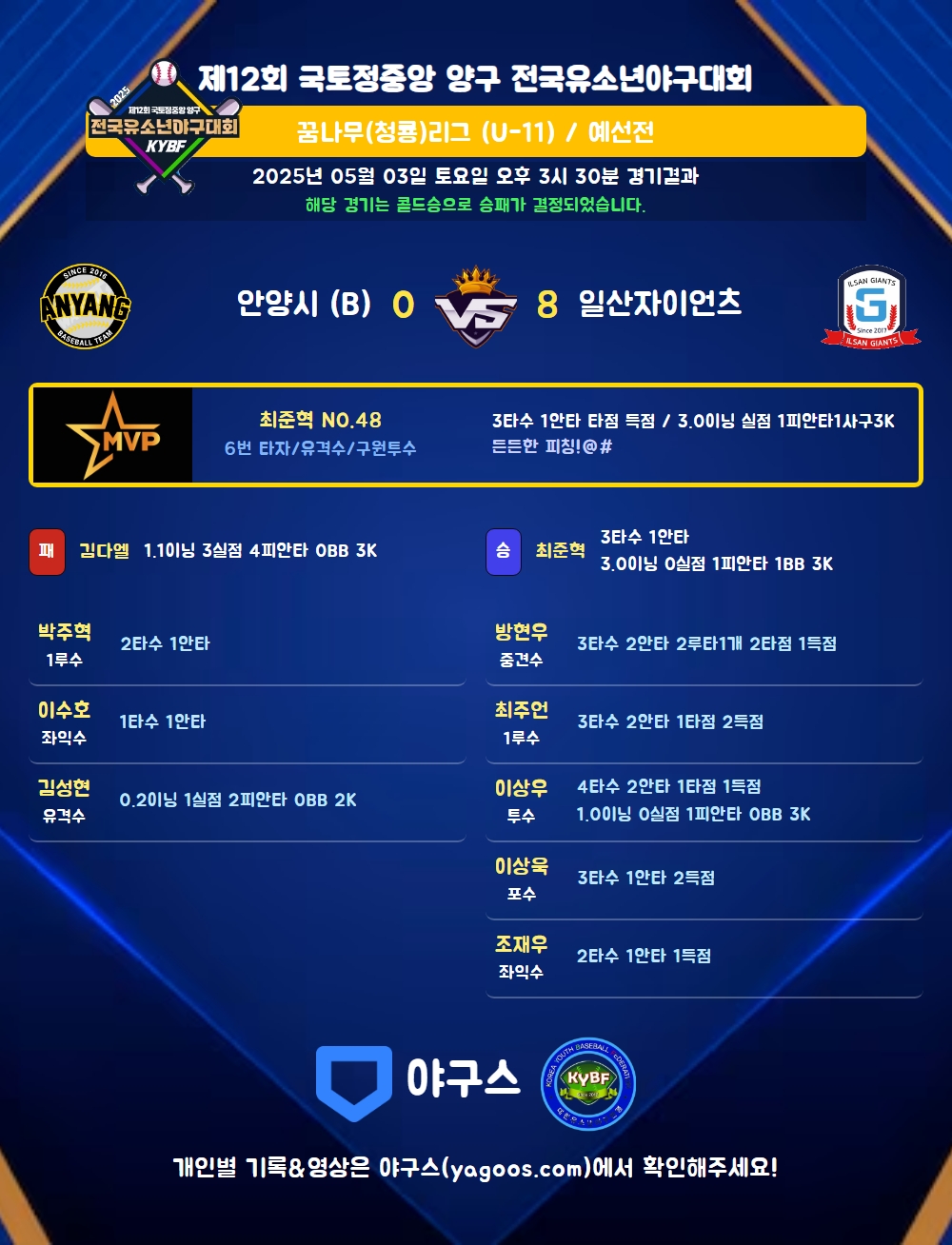 | 일산자이언츠 | 3 | 0 | 1 | 4 | 0 | 0 | 8 | 10 | 0 | 6 | 7 |
