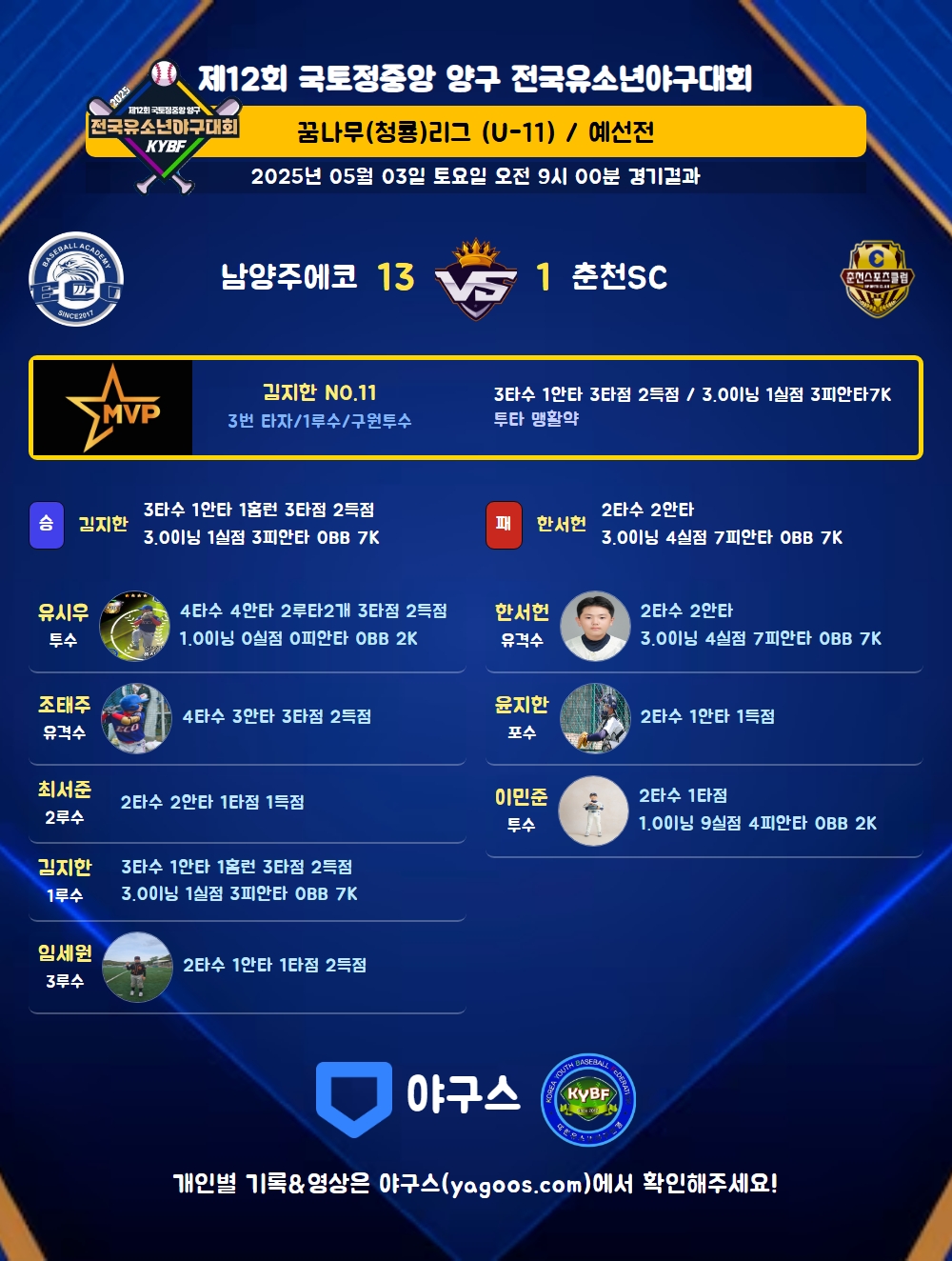 | 1 | 김지한(11) | 승 | 3.0 | 14 | 12 | 3 | - | 2 | 7 | 68 | 1 | 1 | 3.00 |
