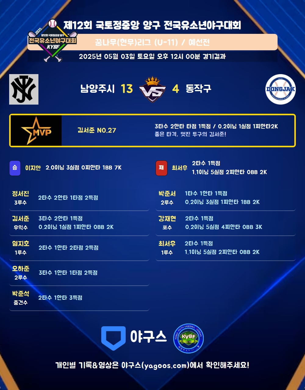 | 5 | 우 | 김서준(27) | 우땅 | 3번안 | 3내안 | - | - | - | 3 | 2 | - | 1 | - | 1 | - | - | 0.667 |