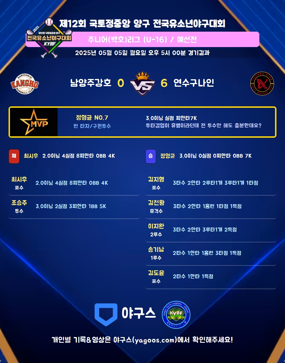 | 1 | 정영균(7) | 승 | 3.0 | 10 | 9 | - | - | 1 | 7 | 43 | - | - | 0 |