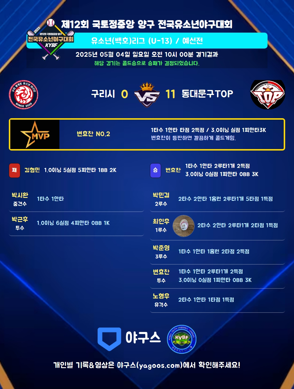 변효찬이 등판하면 깔끔하게 콜드게임.