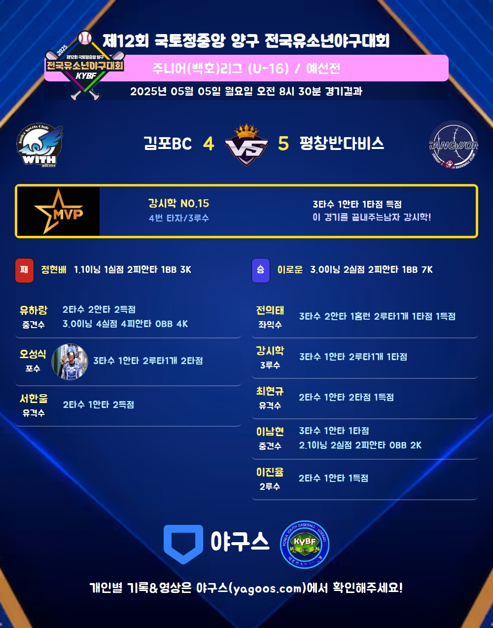 | 평창반다비스 | 0 | 3 | 1 | 0 | 1 | 0 | 5 | 7 | 1 | 3 | 2 |