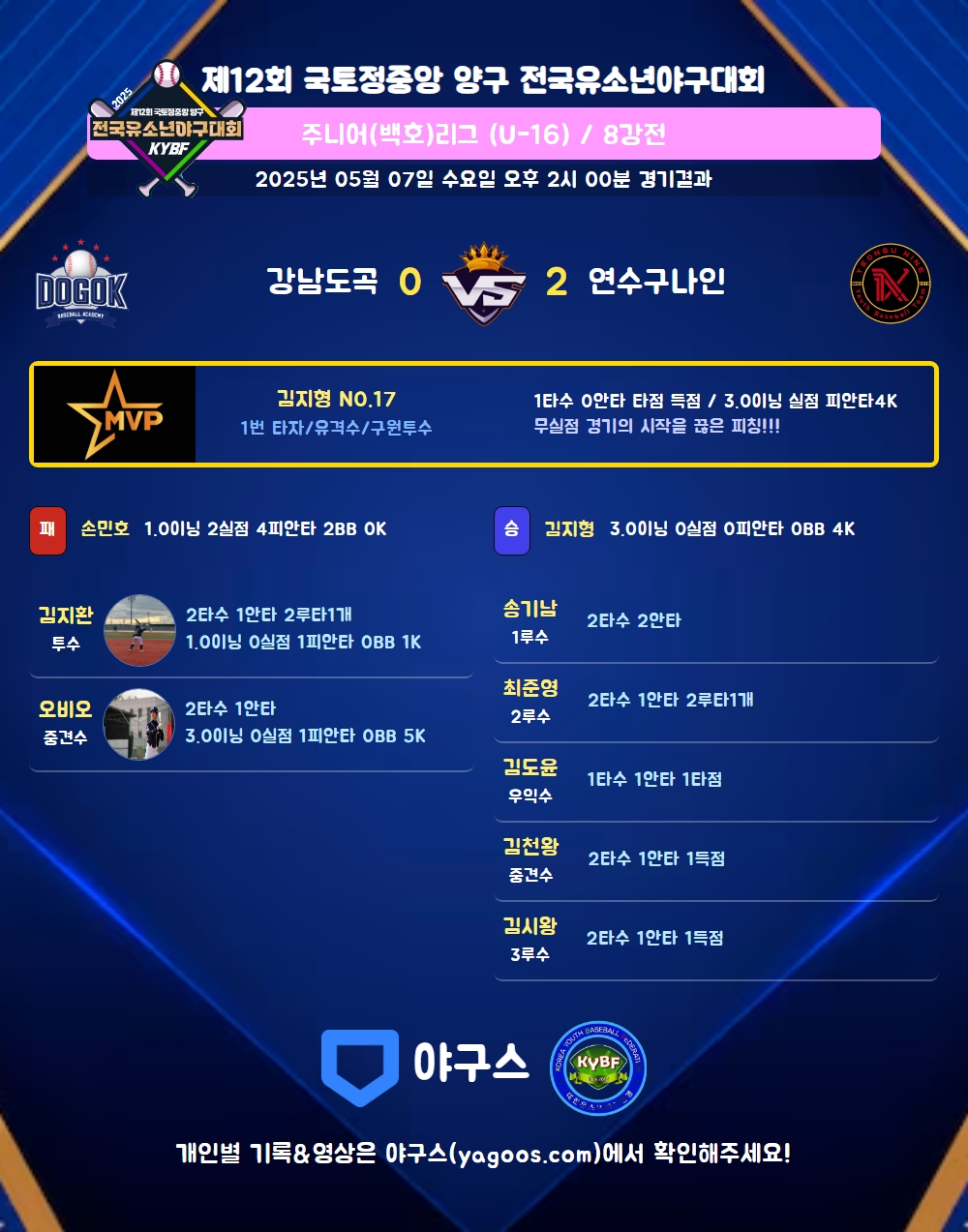 | 1 | 김지형(17) | 승 | 3.0 | 9 | 9 | - | - | - | 4 | 35 | - | - | 0 |