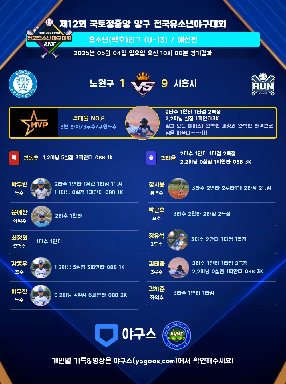 | 1 | 김태율(8) | 승 | 2.2 | 11 | 10 | 1 | - | 1 | 3 | 37 | - | - | 0 |