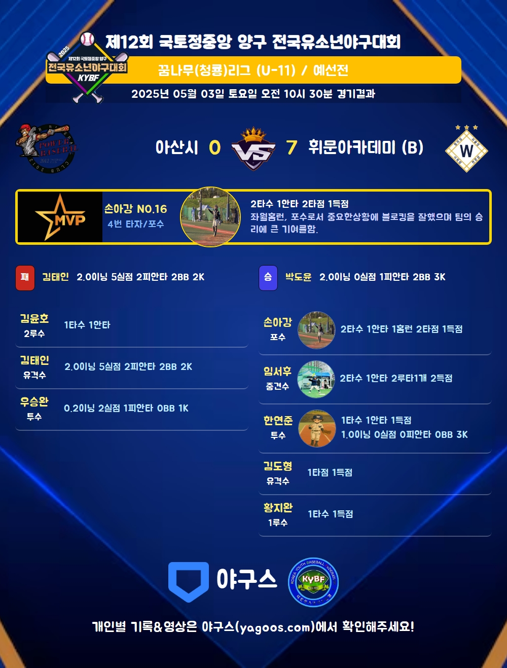 | 휘문아카데미 (B) | 2 | 3 | 2 | 0 | 0 | 0 | 7 | 4 | 0 | 6 | 2 |
