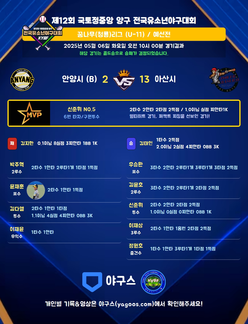 | 6 | 투 | 신준휘(5) | 중안(2타점) | 중안 | - | - | - | - | 2 | 2 | 2 | 2 | - | - | - | - | 1.000 |