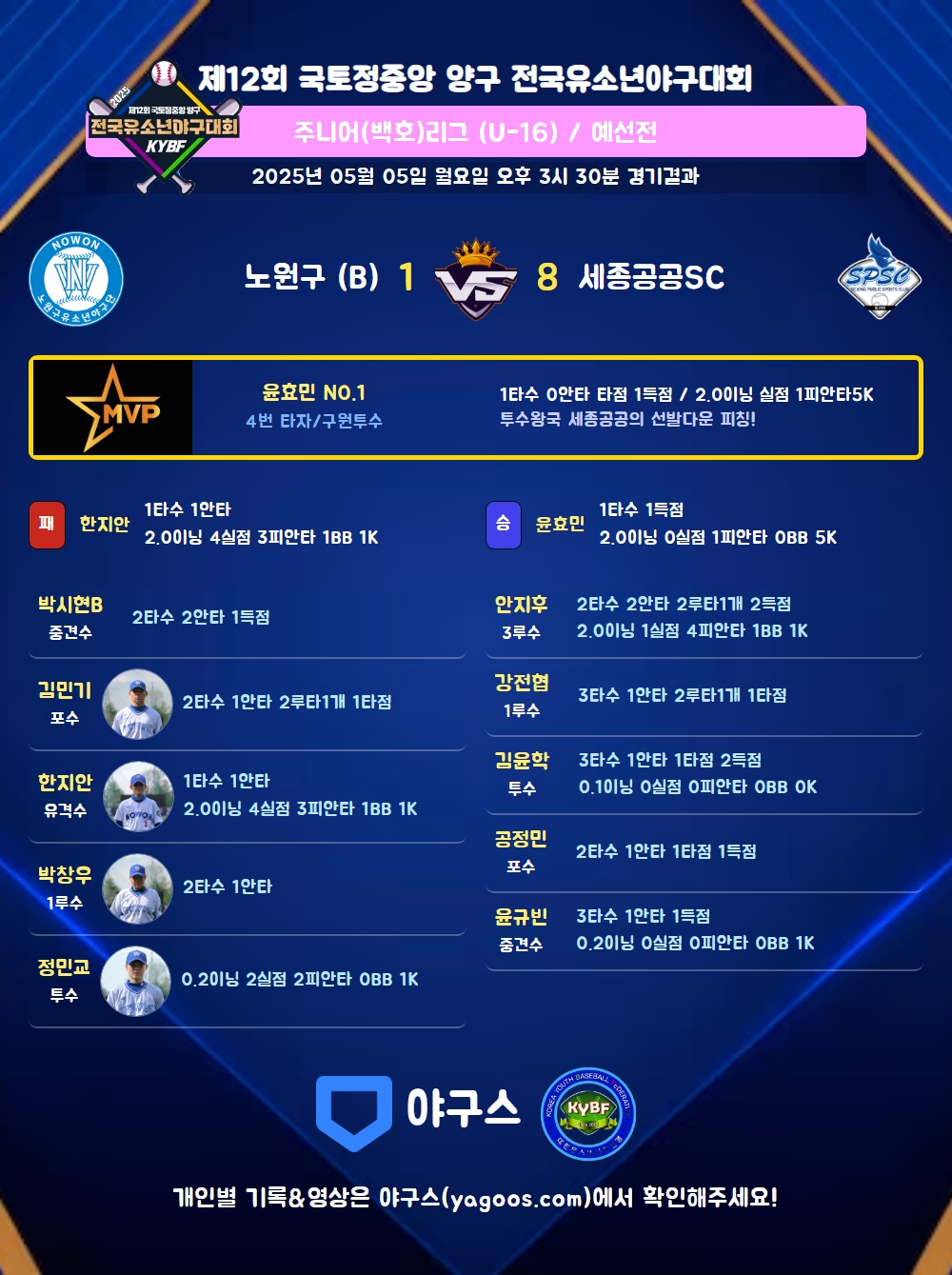 | 1 | 윤효민(1) | 승 | 2.0 | 7 | 7 | 1 | - | - | 5 | 31 | - | - | 0 |