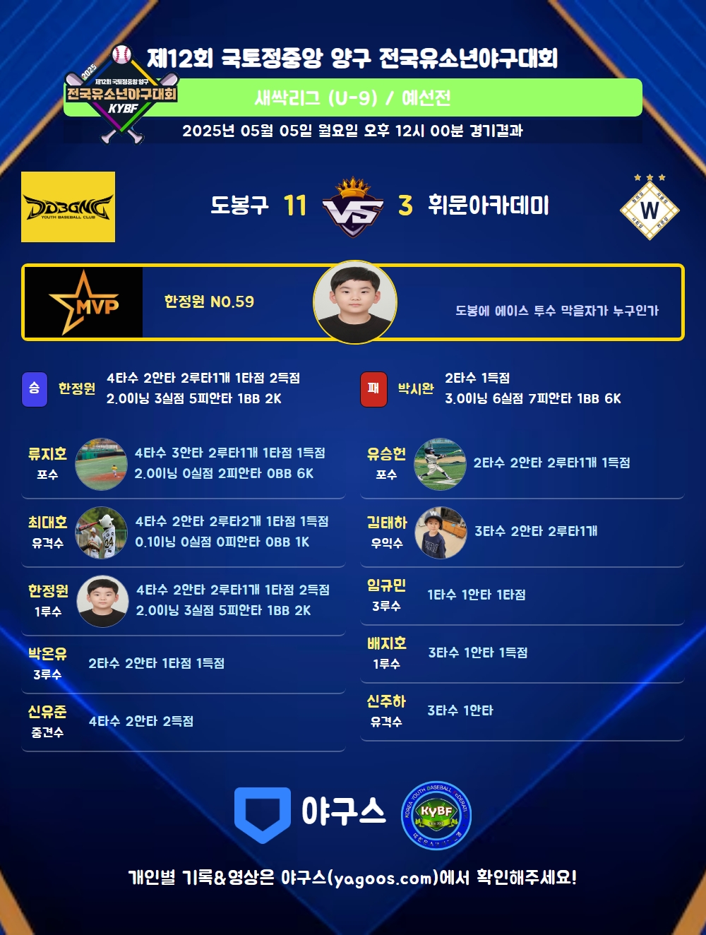 | 2루타 | 한정원(12) 류지호(11) 서은우(50) 최대호(24) 유승헌(36) 김태하(50) |