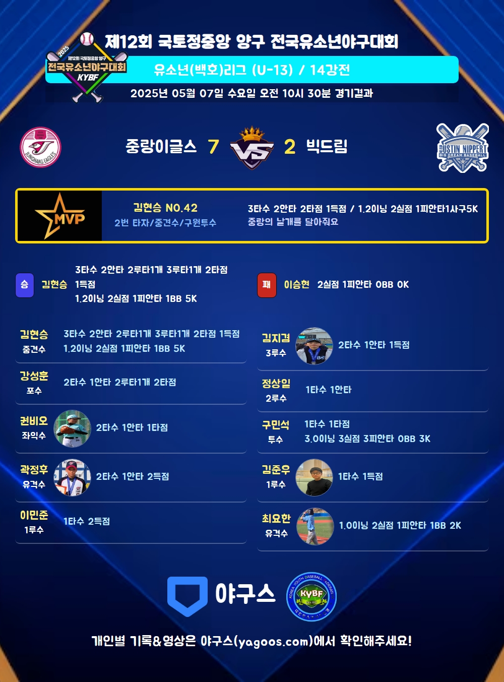 | 7 | 중 | 박윤범(173) | 삼진 | - | - | 삼진 | - | 2 | 0 | - | - | - | - | - | 2 | 0.000 |