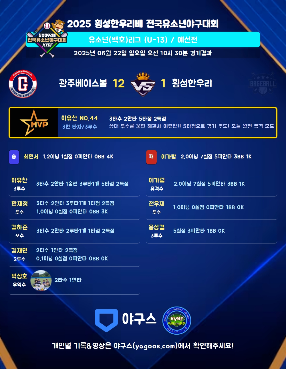 | 1 | 최현서(13) | 승 | 1.2 | 8 | 5 | - | - | 3 | 4 | 36 | 1 | 1 | 5.40 |