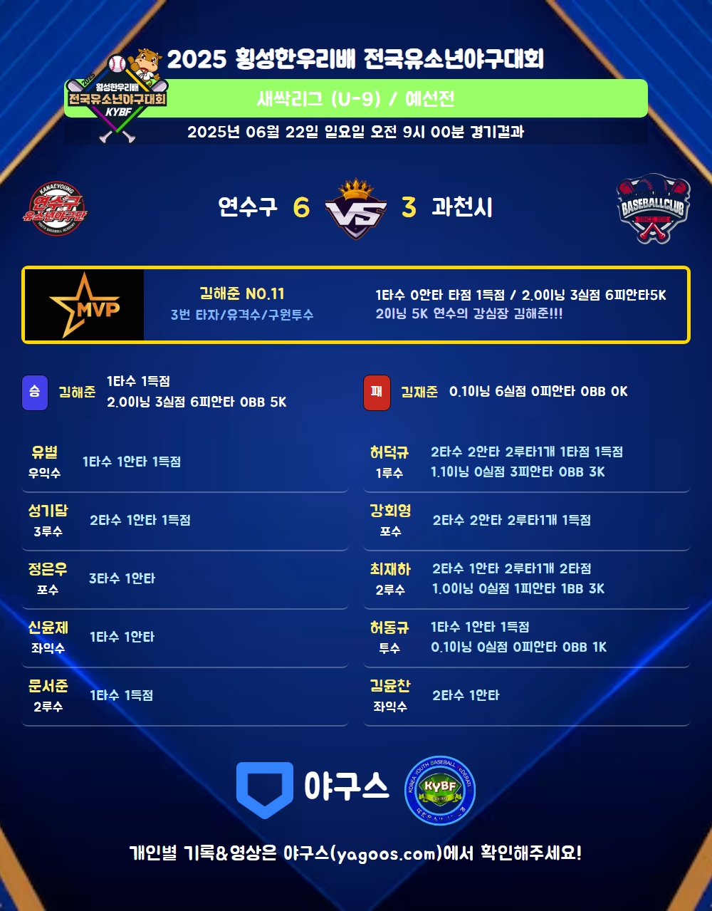 | 3 | 유 | 김해준(11) | 4구/삼진 | - | 4구 | - | - | 1 | 0 | - | 1 | - | - | 2 | 1 | 0.000 |