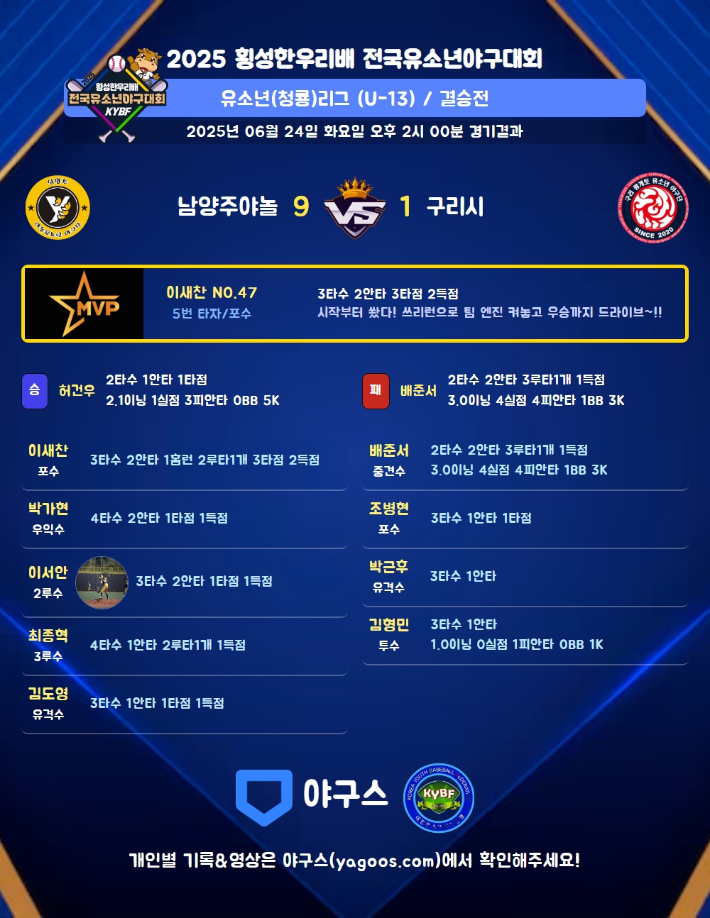 | 2루타 | 최종혁(51) 이새찬(47) |