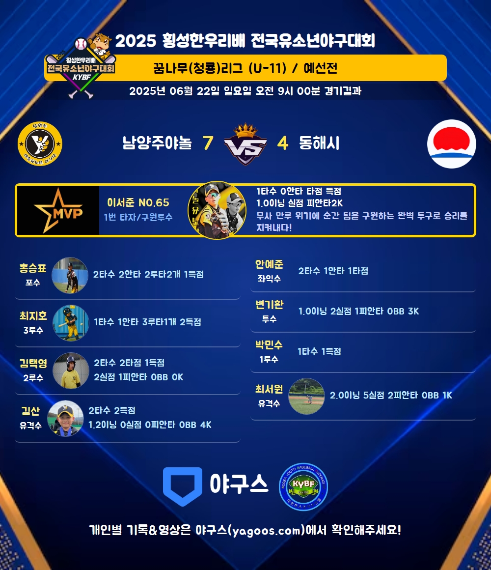 | 1 | 투 | 이서준(65) | 2플 | 4구 | - | - | - | 1 | 0 | - | - | - | 1 | 1 | - | 0.000 |