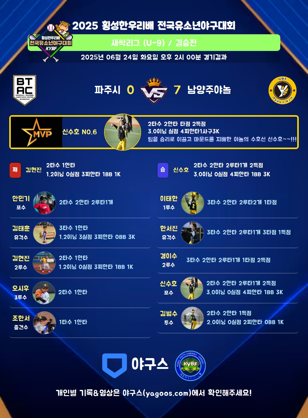 | 2루타 | 안민기(4) 신수호(6) 경이수(22) 한서진(4) 김진현(5) 이태한(2) |