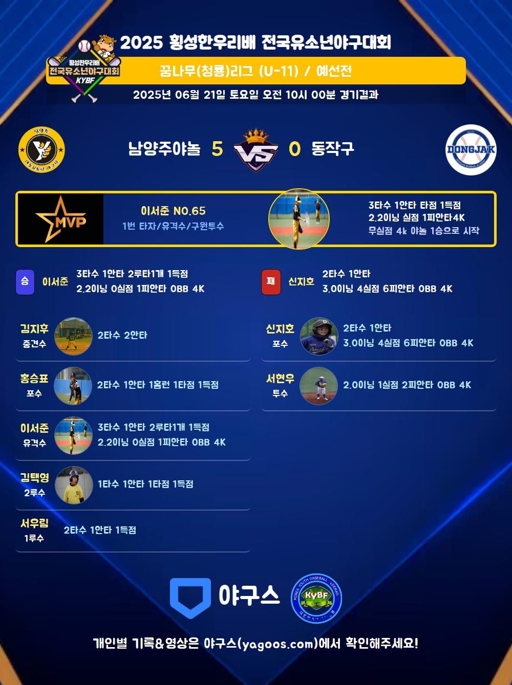 | 1 | 이서준(65) | 승 | 2.2 | 10 | 8 | 1 | - | 2 | 4 | 42 | - | - | 0 |