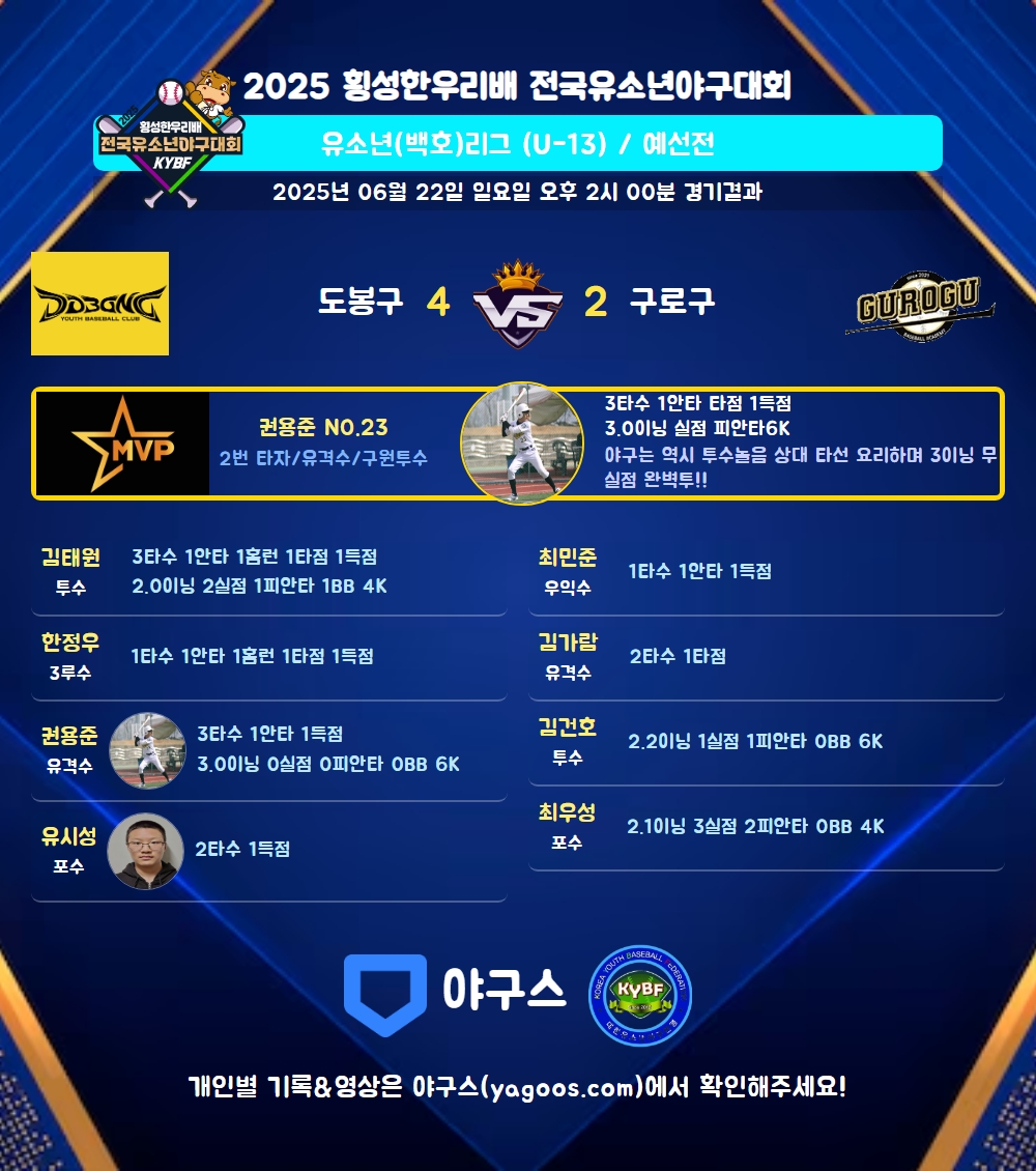 | 2 | 유 | 권용준(23) | 2땅 | - | 좌선안 | - | 2플 | - | - | 3 | 1 | - | 1 | - | 1 | - | - | 0.333 |