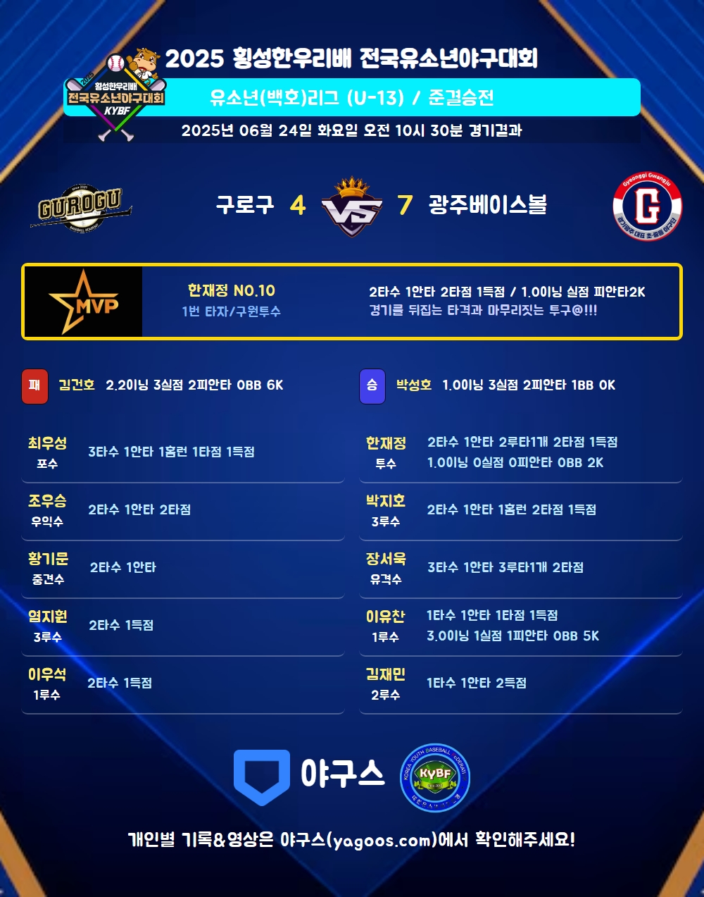 | 광주베이스볼 | 1 | 3 | 0 | 3 | 0 | 7 | 7 | 2 | 4 | 4 |
