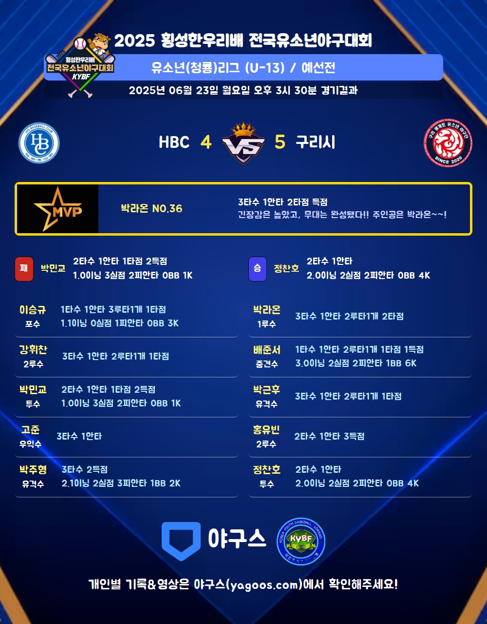 | 2루타 | 강휘찬(61) 박근후(7) 배준서(10) 박라온(36) |