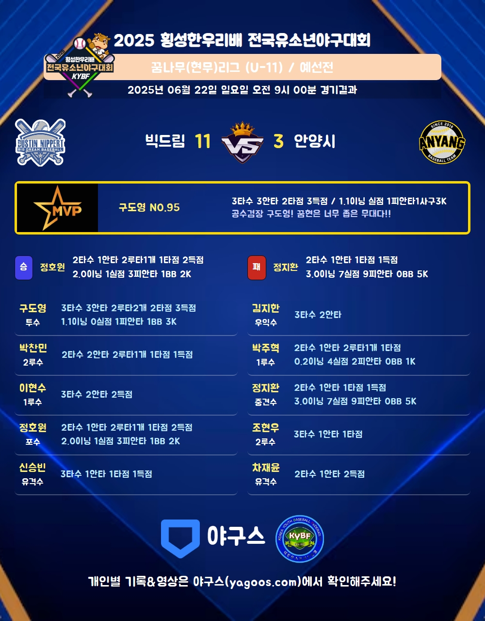 | 2루타 | 구도영(95) 정호원(32) 박찬민(64) 박주혁(43) |