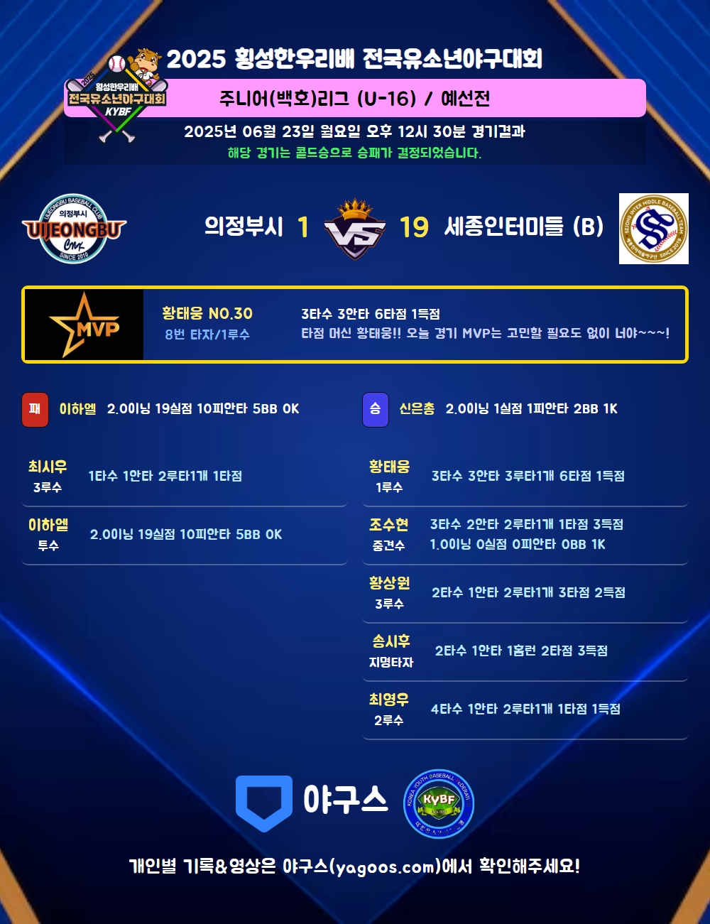 | 6 | 三 | 황상원(16) | 포파플 | 사구(1타점)/좌선2(2타점) | - | - | - | - | - | 2 | 1 | 3 | 2 | - | - | 1 | - | 0.500 |