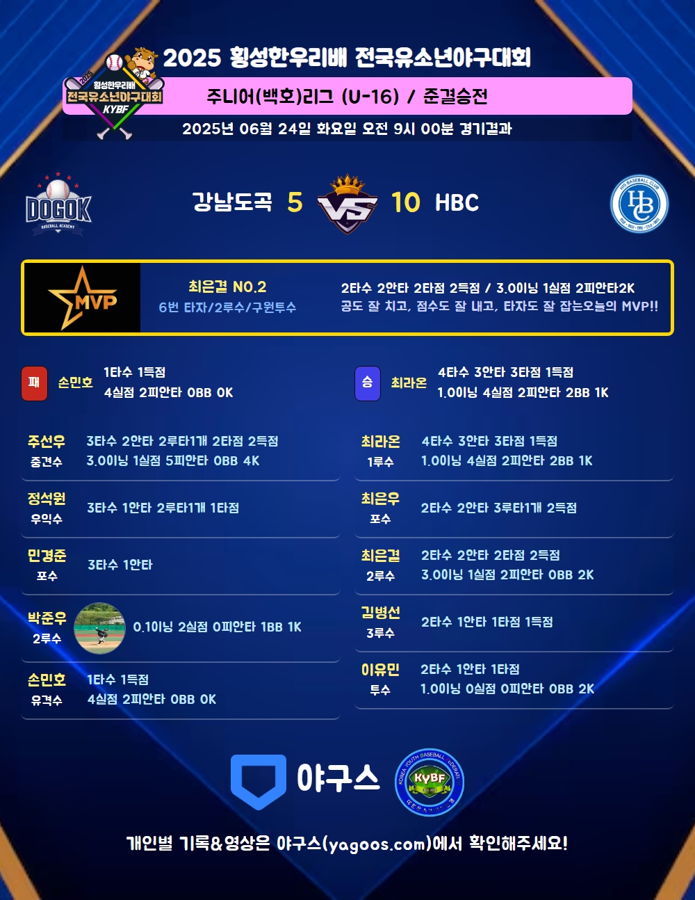 | 5 | 포 | 민경준(23) | - | 좌안 | - | 2땅 | 삼진 | - | - | 3 | 1 | - | - | - | - | - | 1 | 0.333 |