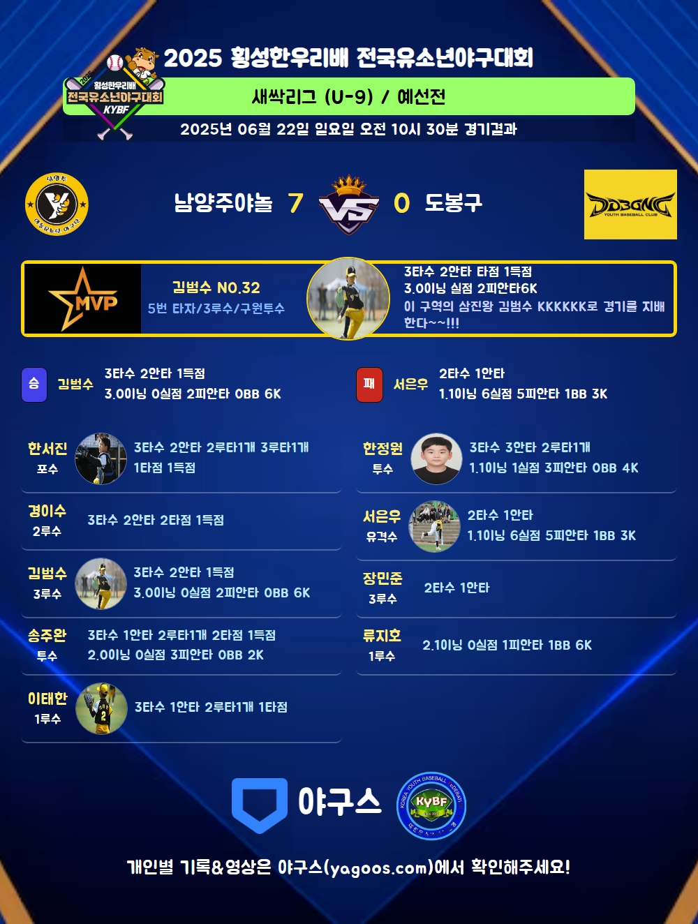 | 2루타 | 신수호(6) 송주완(10) 한서진(4) 이태한(2) 한정원(12) |