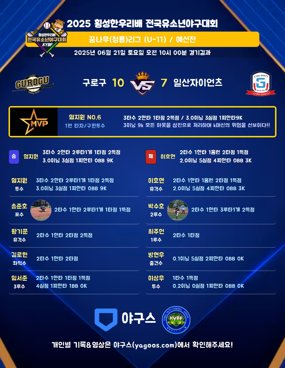 | 일산자이언츠 | 5 | 1 | 1 | 0 | 0 | 7 | 2 | 2 | 6 | 2 |
