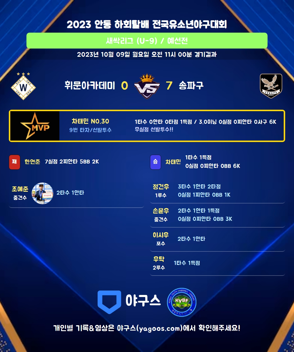 | 9 | 투 | 차태민(30) | - | 4구 | 사구 | 삼진 | - | 1 | 0 | 0 | 1 | 0 | 0 | 2 | 1 | 0.000 |