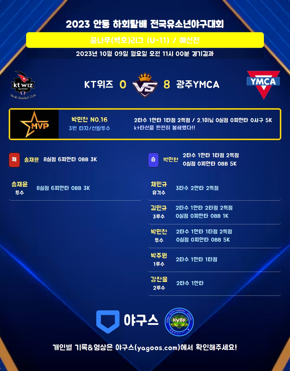 | 3 | 투 | 박민찬(16) | 좌중2 | 투실 | - | - | 2 | 1 | 1 | 2 | 0 | 1 | - | 0 | 0.500 |