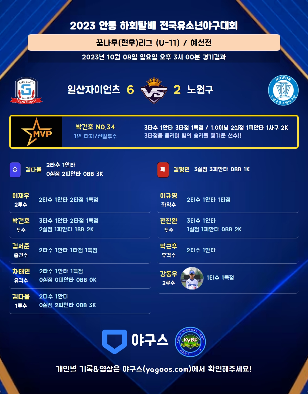 | 일산자이언츠 | 0 | 1 | 2 | 3 | 0 | 0 | 6 | 5 | 0 | 7 | |