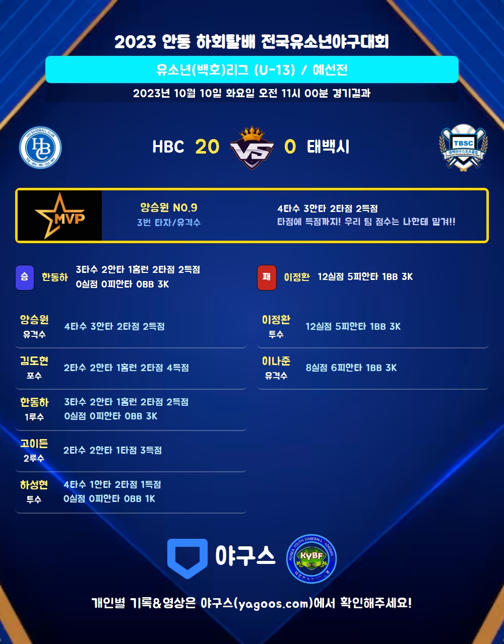 | 2 | 한동하(8) | 승 | - | 4 | 0 | 0 | 0 | 1 | 3 | 19 | 0 | 0 | 0 |