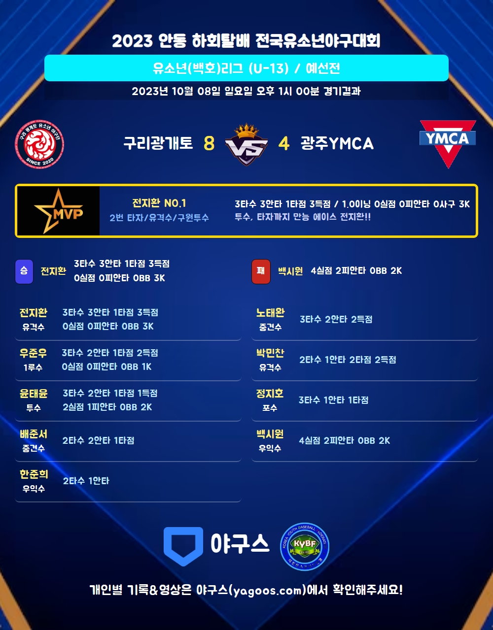 | 5 | 투 | 윤태윤(32) | - | 중전안 | 우선3 | 삼진 | 3 | 2 | 1 | 1 | 0 | 0 | - | 1 | 0.667 |