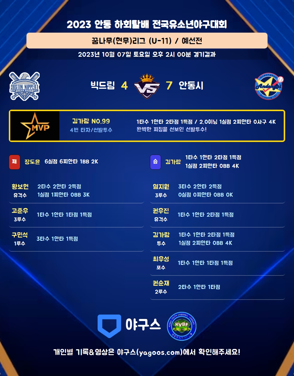 | 3 | 三 | 고준우(21) | 유내2 | - | 4구 | - | 1 | 1 | 1 | 1 | 0 | 2 | 1 | 0 | 1.000 |