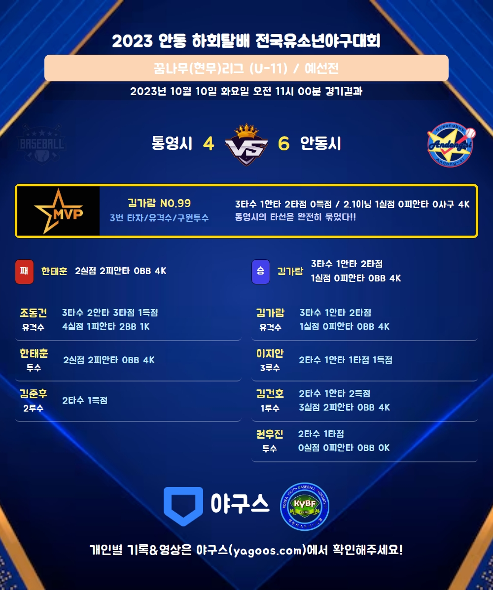 | 1 | 一 | 김건호(100) | 우땅 | - | 중전안 | 사구 | - | 2 | 1 | 0 | 2 | 0 | 2 | 1 | 0 | 0.500 |