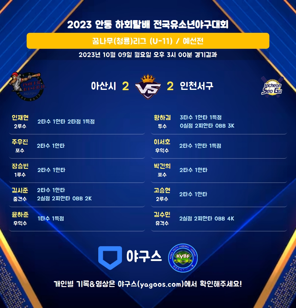 | 3 | 포 | 박건희(11) | 3실 | - | 사구 | - | 좌중2 | 2 | 1 | 0 | 0 | 0 | 0 | 1 | 0 | 0.500 |