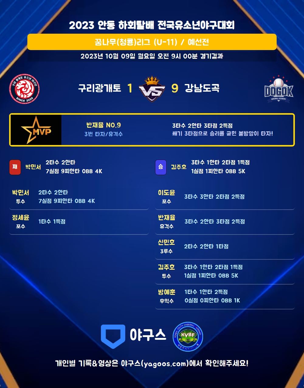 | 1 | 박민서(13) | 패 | - | 15 | 9 | 9 | 0 | 1 | 4 | 61 | 7 | 7 | 0 |