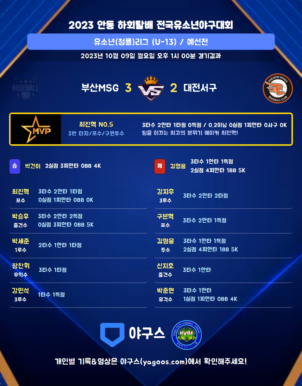 | 1 | 박건이(23) | 승 | - | 11 | 3 | 3 | 0 | - | 4 | 39 | 2 | 2 | 0 |