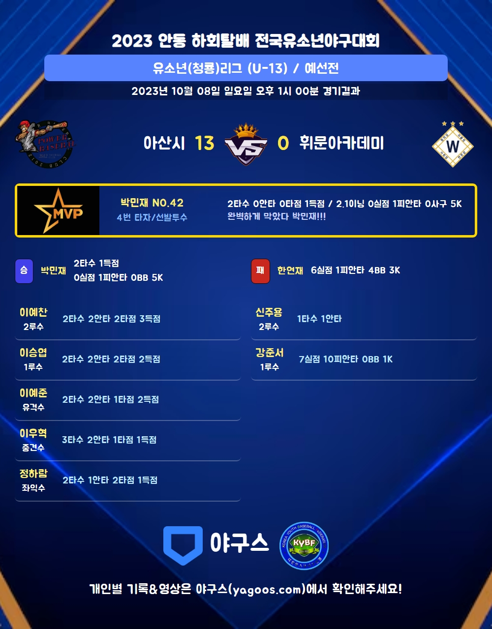 | 1 | 박민재(42) | 승 | - | 9 | 1 | 1 | 0 | 1 | 5 | 37 | 0 | 0 | 0 |