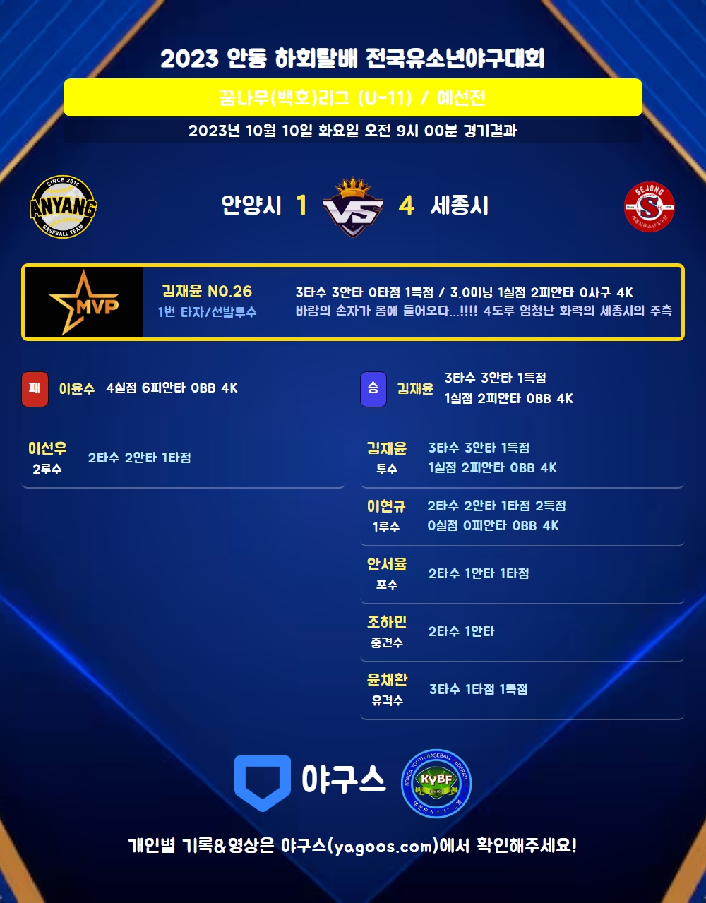 | 5 | 중 | 조하민(29) | 3땅 | - | 중전안 | - | - | 2 | 1 | 0 | 0 | 0 | 0 | - | 0 | 0.500 |