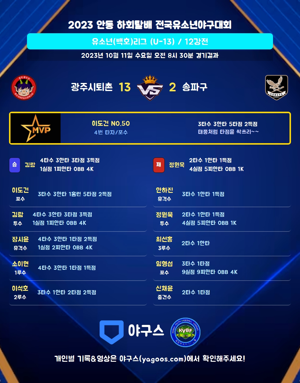 | 4 | 포 | 이도건(50) | 좌중홈 | - | 4구 | 우선3 | 좌중3 | 3 | 3 | 5 | 2 | 1 | 1 | 1 | 0 | 1.000 |