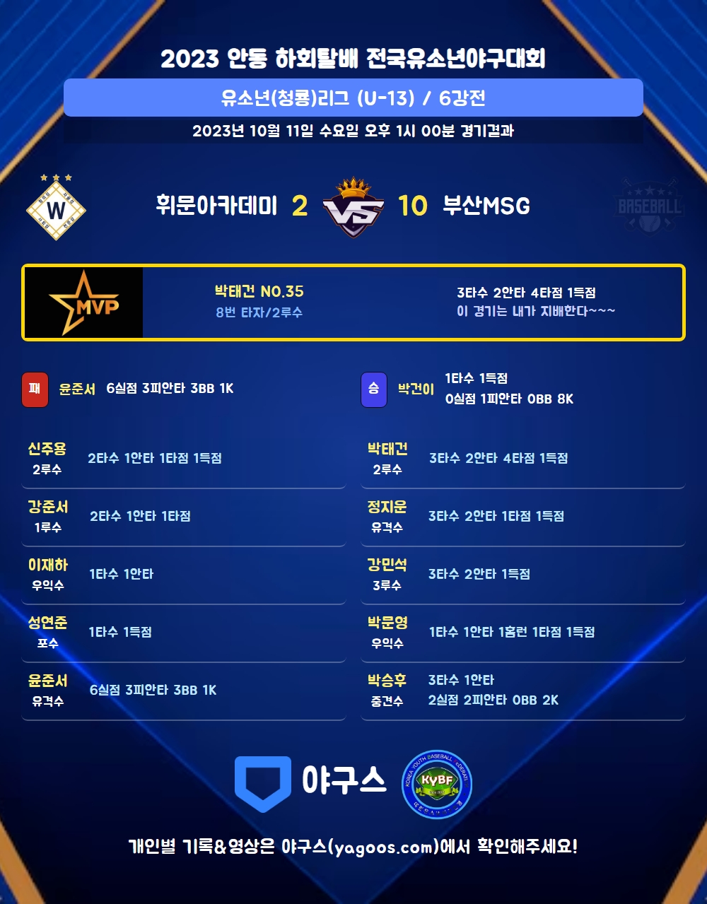 | 1 | 박건이(23) | 승 | - | 11 | 1 | 1 | 0 | 1 | 8 | 50 | 0 | 0 | 0 |