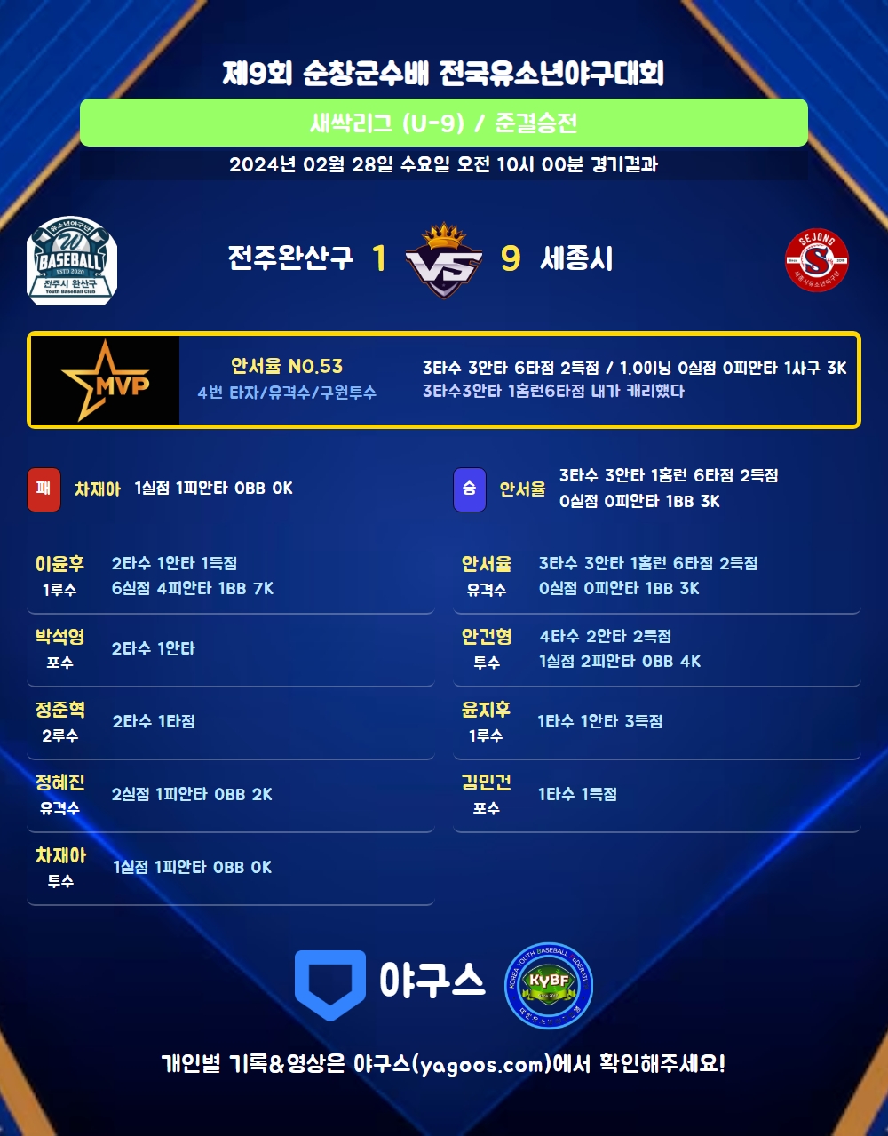 | 9 | 좌 | 서범준(15) | - | - | - | - | - | 0 | 0 | 0 | 0 | 0 | 0 | - | 0 | 0.000 |
