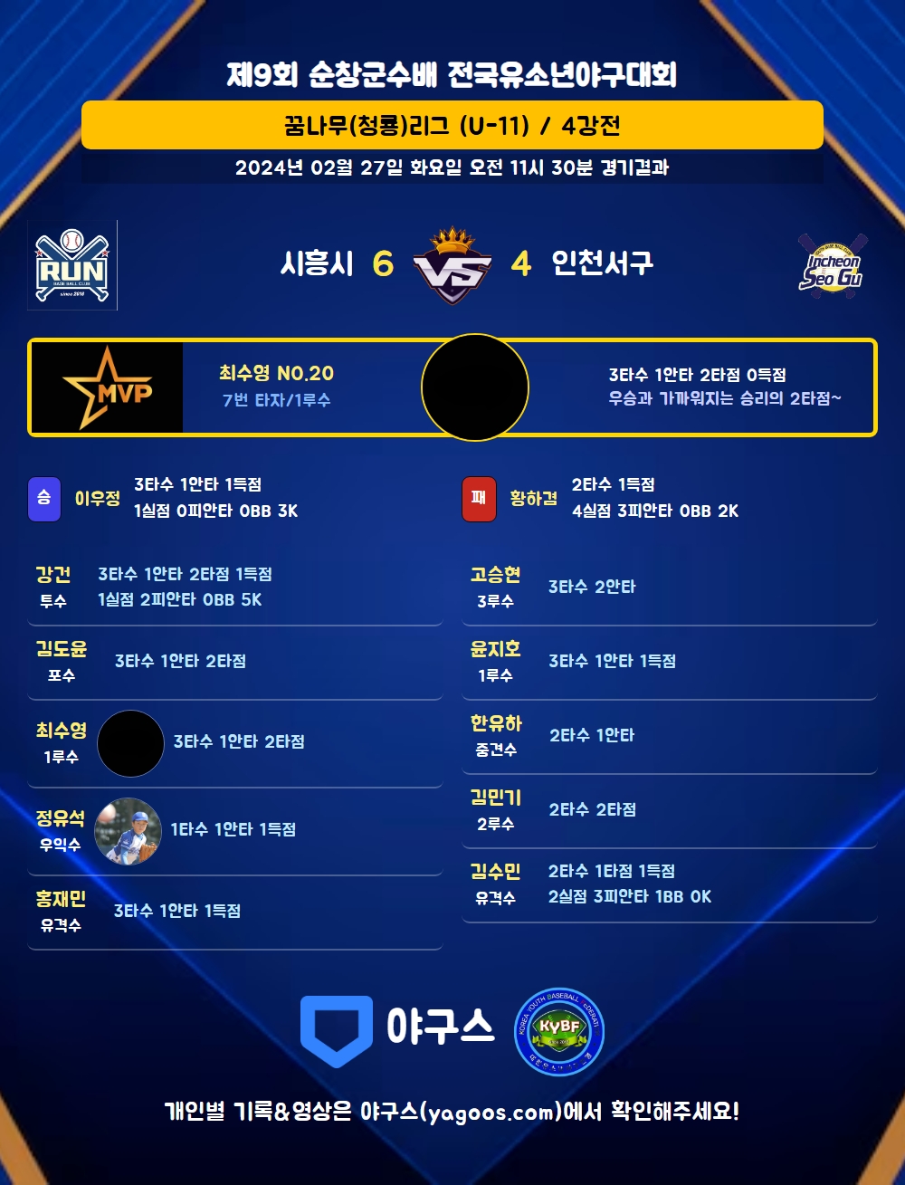 | 6 | 二 | 김유수(16) | - | 투땅 | 투땅 | - | 4구 | 2 | 0 | 0 | 1 | 0 | 1 | 1 | 0 | 0.000 |